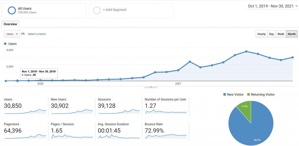 During the first few months, our workload was enormous putting the plan into place, however, rewards were low. Our work didn’t really start taking effect for the first few months (which is always the case when it comes to SEO). Take a look at the graph here that shows you exactly how search has grown this business. From 0 hits per day as the company was new, right up to 3000+ visits each month.